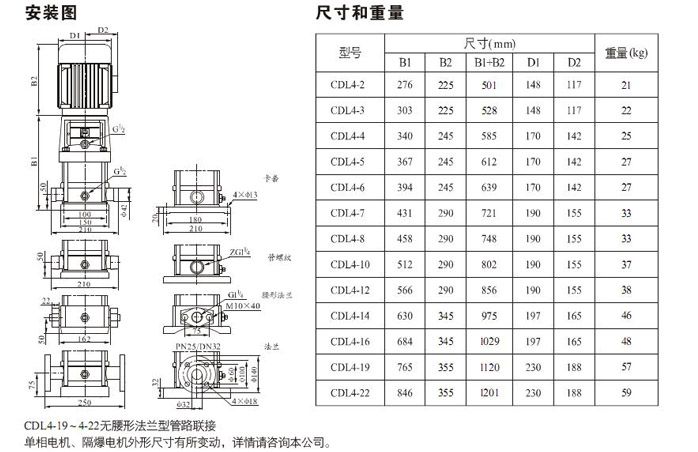 產品介紹 CDLF4-10FSWSC 不銹鋼立式多級離心泵是一種多功能產品,可以輸送從自來水到工業液體的各種不同介質,適應于不同溫度、流量和壓力范圍,CDL適用于無腐蝕性液體,CDLF適用于輕度腐蝕性液體。 水:水廠過濾與輸送、水廠分區送水、主管增壓、高層建筑增壓。 工業增壓:流程水系統、清洗系統、高壓沖洗系統、消防系統。 工業液體輸送:冷卻和空調系統、鍋爐給水和冷凝系統、機床配套、酸和堿。 水處理:超濾系統、反滲透系統、蒸餾系統、分離器、游泳池。 灌溉:農田灌溉、噴灌、滴灌。 運行條件 稀薄、干凈、非易燃易爆并不含固體顆粒或纖維的液體。 液體溫度:常溫型 -15℃至+70℃ 熱水型 -15℃至+120℃ 環境溫度:最高+40℃ 海拔:最高1000m CDLF12-3FSWSC 不銹鋼工業增壓泵為安裝標準電機的非自吸式多級離心泵,電機軸通過泵頭用軸聯器直接與泵軸連接,拉桿螺栓將耐壓筒、過流部件固定在泵頭和進出水段之間,泵進出水口在泵底同一直線上;本泵可根據需要配置智能保護器,對泵干轉、缺相、過載等進行有效保護。 電機 電機為全封閉,風冷式二極標準電機。 防護等級:IP55 絕緣等級:F 標準電壓, 50Hz ![]() ![]() ![]() 因產品生產批次、型號不同,產品圖片及安裝尺寸僅供參考,詳情可聯系我們的銷售人員了解更多CDLF4-10FSWSC 不銹鋼立式多級離心泵相關信息!