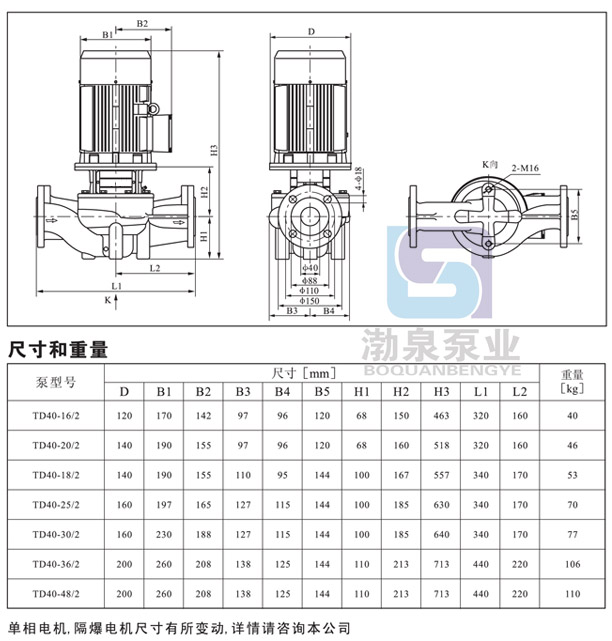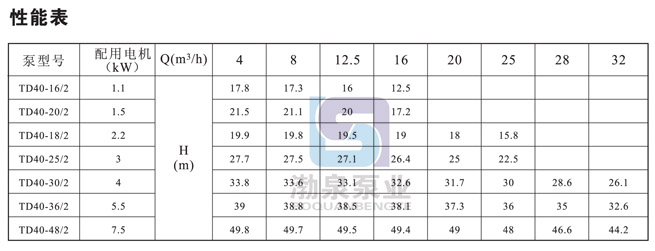產品介紹 TD40-30/2 立式管道離心泵配有標準電機和機械密封。此類產品的結構與相近類型產品相比,更不易受到泵送液體中雜質的影響。 產品設計為頂部可拉出的拆裝形式,其可以在不影響管路系統的情況下對泵進行維護。 應用 產品適宜在清潔、稀薄、非侵蝕、非易爆易燃,且不含有任何可能對泵造成機械或化學損害的固體顆粒和纖維的液體中使用。具體對液體要求及應用如下;而在液體粘稠或密度較大情況下使用時會造成泵特性曲線的下降和能耗的增加。 液體溫度:-15℃~110℃ 系統最高壓力:常規型為PN12巴;特殊型為PN16巴。 TD40-30/2 立式管道離心泵產品在用于輸送水時,其可以用于生活用水、工業用水、冷卻系統用水和區域供熱系統的冷、熱用水。TD管道泵產品可以在以下位置使用: ·主循環泵 ·混合環路中的泵 ·鍋爐混流泵 ·燃氣冷凍機泵 ·部分流量過濾器泵 ·定壓系統用泵 ·生活熱水循環 TD40-30/2 立式管道離心泵產品用于工業方面。如在化工、制藥、食品加工等行業。可以用于: ·原料的輸送 ·系統增壓 ·混合環路循環泵 ![]() ![]() ![]() 安裝條件 TD40-30/2 立式管道離心泵有不同的安裝要求,具體的安裝要求如下: ·系統管路具有支撐泵的能力,2.2kw以下(包括2.2kw)電機的泵可以直接懸置于管道中 ;系統管路不具有支撐泵的能力或泵電機功率大于2.2kw時,泵必須安裝在支架或底板上。 ·對于配套2.2kw以下(包括2.2kw)電機的泵可以安裝在水平或垂直于管道的位置上;對于2.2kw以上電機的泵只能安裝在垂直于管道的位置上。 ·離心泵的安裝,要保證泵在使用時系統管路的張力不應傳遞到泵體上。 ·為了保證電機的正常運轉,泵要安裝在保證有足夠冷卻的環境條件下,且冷卻空氣的溫度不能超過40℃。 ·如果泵安裝在戶外,必須配置合適的外罩以防止電器元件進水或凝霜。 ·為了方便對泵的檢查和維修,在泵的上、下方必須留有足夠的空間。泵電機小于5.5kw時最小留300mm;泵電機大于5.5kw(包括5.5kw)時最小留1000mm。 ·為了防止噪音和振動,保證獲得最佳運行效果,泵在安裝時要采用減振底座。一般采用水泥底座,底座的重量應該是大于或等于1.5×泵重量。 ·為滿足客戶的不同需要,產品分為帶底板和不帶底板兩種。 因產品生產批次、型號不同,產品圖片及安裝尺寸僅供參考,詳情可聯系我們的銷售人員了解更多TD40-30/2 立式管道離心泵相關信息!