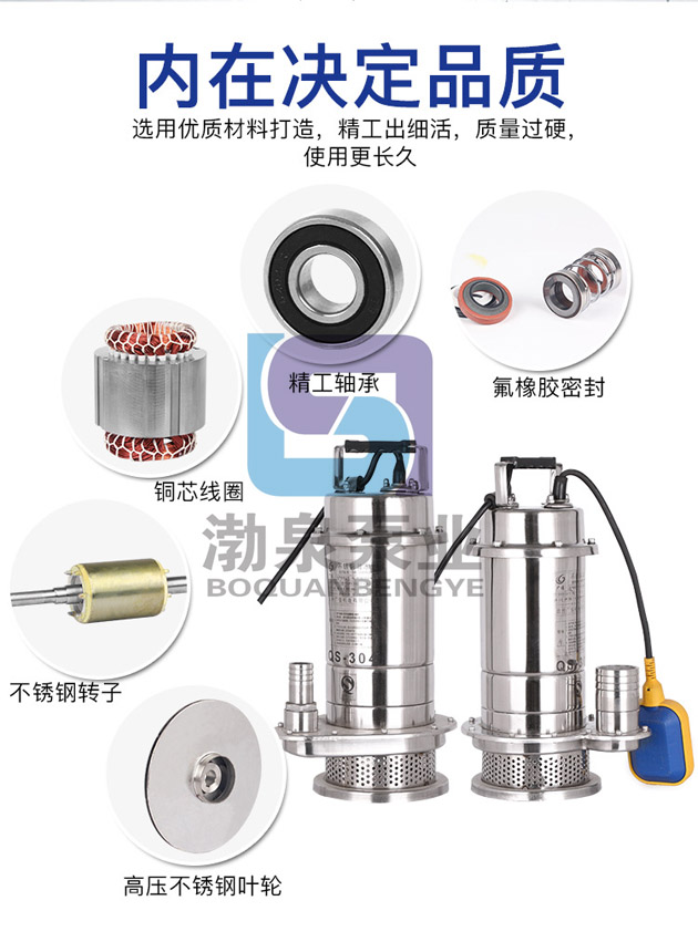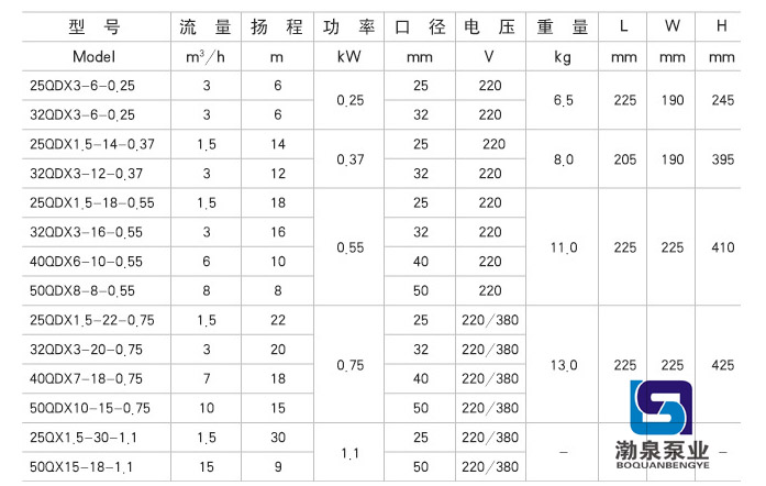 產品介紹 25QDX1.5-14-0.37 耐腐蝕小型潛水泵由水泵、密封、電動機三部分組成。電動機位于電泵上部,為單相或三相異步電動機,水泵位于電動機下部,為離心式葉輪,渦殼結構,水泵與電機之間采用雙端面機械密封。 用途: 25QDX1.5-14-0.37 耐腐蝕小型潛水泵系列不銹鋼潛水泵,主要用于農田灌溉、養殖供水、園林澆噴、旅館、食堂、高層建筑供水等。 優點: 體積小、重量輕、移動方便、安裝簡便、揚程高。 使用條件: 潛水泵在下列使用條件下應能連續正常工作: 1、介質溫度不超過+40℃; 2、介質的PH值在6.5-8.5之間; 3、介質中含固體雜質的體積比不超過0.1%,粒度不大于0.2mm 4、電源頻率為50Hz,電壓單相220V、三相380V,電壓波動范圍為額定值的0.9-1.1倍; 5、潛水深度不超過5m。 使用注意事項 1、使用前請仔細檢查電纜線,檢查是否在運輸過程中是否造成電纜線的破損。檢查完好后接入控制箱使用。 2、控制箱必須帶有過流、過壓(三相380V±5%、單相220V±5%的電源范圍內)、缺相、反轉、防漏電功能等保護裝置。 3、必須斷開電源后對水泵進行檢查維修。 4、在未斷開電源的情況下身體任何部位(特別是手指)不得靠近水泵進水口位置。避免以外發生。 ![]() ![]() ![]() 因產品生產批次、型號不同,產品圖片及安裝尺寸僅供參考,詳情可聯系我們的銷售人員了解更多25QDX1.5-14-0.37 耐腐蝕小型潛水泵相關信息!