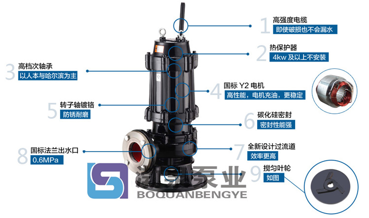 產(chǎn)品介紹 50WQ20-80-18.5 80米揚程潛水排污泵是在引進(jìn)國外現(xiàn)先進(jìn)技術(shù)的基礎(chǔ)上,結(jié)合國內(nèi)水泵的使用特點而研制成功的新一代泵類產(chǎn)品,具有節(jié)能效果顯著、防纏繞、無堵塞、自動安裝和自動控制等特點。在排送固體顆粒和長纖維垃圾方便,具有獨特效果。該系列排污泵采用獨特葉輪結(jié)構(gòu)和新型機械密封,能有效地輸送含有固體物和長纖維。葉輪與傳統(tǒng)葉輪相比,該泵葉輪采用單流道或雙流道形式,它類似于一截面大小相同的彎管,具有非常好的過流性,配以合理的蝸室,使得該泵具有效果高、葉輪經(jīng)動靜平衡試驗,使泵在運行中無振動。 該泵水力性能先進(jìn)、成熟,產(chǎn)品經(jīng)測試各項性能指標(biāo)均達(dá)到有關(guān)標(biāo)準(zhǔn)規(guī)定,產(chǎn)品投放市場后以其獨特的功效,可靠的性能,穩(wěn)定的質(zhì)量受到廣大用戶的歡迎和好評。 50WQ20-80-18.5 80米揚程潛水排污泵應(yīng)用范圍 1.市政工程、建筑工地; 2.住宅區(qū)的污水排放; 3.醫(yī)院、賓館等的污水排放; 4.城市污水處理廠排水系統(tǒng); 5.人防系統(tǒng)排水站,自來水廠的給水裝置; 6.工廠、商業(yè)嚴(yán)重污染污水的排放。 50WQ20-80-18.5 80米揚程潛水排污泵產(chǎn)品特點 1.采用大流道抗堵塞水力部件設(shè)計,大大提高污物通過能力,能有效地通過水泵口徑的5倍纖維物質(zhì)和直徑為泵口徑約30%的固體顆粒。 2.設(shè)計合理,配套電機合理,效率高,節(jié)能效果顯著。 3.機械密封采用雙道串聯(lián)密封,材質(zhì)為硬質(zhì)耐腐碳化鎢,具有耐用、耐磨等特點,可以使泵安全連續(xù)運行8000小時以上。 4.泵結(jié)構(gòu)緊湊,體積小,移動方便,安裝簡便,無需建泵房,潛入水中即可工作,大大減少工程造價。 5.泵油室內(nèi)設(shè)有油水探頭,當(dāng)水泵側(cè)機械密封損壞后,水進(jìn)入油室,探頭發(fā)生信號,對泵實施保護(hù)。 6.可根據(jù)用戶需要配合全自動安全保護(hù)控制柜,對泵的漏水、漏電、過載及超溫等進(jìn)行監(jiān)控,保證泵運行可靠安全。 7.雙導(dǎo)軌自動耦合安裝系統(tǒng),給泵的安裝、維修帶來了極大的方便,人可不必為此而進(jìn)出污水坑。 8.浮球開關(guān)可根據(jù)所需的水位變化,自動控制泵的停啟,無需專人看管。 9.在使用揚程范圍內(nèi)保證電機運行不過載。 10.根據(jù)使用場合電機可采用水套式外循環(huán)冷卻系統(tǒng),能保證水泵在無水(干式)狀態(tài)下安全運行。 11.安裝方式有固定式自動耦合安裝和移動式自由安裝二種,可滿足不同的使用場合。 型號意義 50WQ25-32-5.5 50-泵排出口公稱直徑(mm) QW-潛水排污泵 25-額定流量(m3/h) 32-額定揚程(m) 5.5-配用電機額定功率(kW) ![]() 主要性能參數(shù)