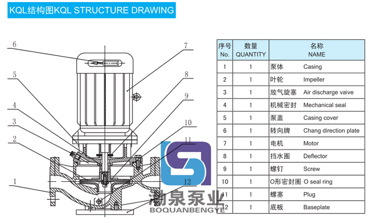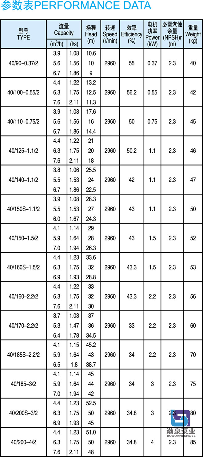 產品介紹 KQL40/200-4/2 立式供暖管道循環泵供輸送不含固體顆粒的清水及物理化學性質類似于水的液體之用。同時根據使用溫度、介質等不同在ISG型管道離心泵基礎上派出適用熱水、高溫、腐蝕性化工泵、油泵。該產品具有同效節能、噪音低、性能穩定等特點。 用途: KQL40/200-4/2 立式供暖管道循環泵用于空調、采暖、衛生用水、水處理冷卻冷凍系統、液體循環和供水、增壓及灌溉等領域中無腐蝕的冷水和熱水輸送。 工作條件: 轉速:2960r/min,1480r/min或980r/min 流量范圍:1.8~2000m3/h 揚程:≤127m 介質溫度:-10℃~120℃ 環境溫度:最大+40℃;海拔高度小于1000m;相對濕度不超過95% 材質: 泵殼、泵蓋、葉輪:鑄鐵 泵軸:45#鋼鍍鉻或不銹鋼(2Cr13) 機械密封動、靜環:浸銻石墨、碳化硅 結構:結構緊湊的單級泵,適用于現代建筑物。 產品特點: KQL40/200-4/2 立式供暖管道循環泵結構緊湊、合理,泵與電機直接連接,外形美觀,占地面積小效率高,閉式鑄鐵葉輪,葉輪懸臂短,機泵軸完全同心,泵運行平穩、可靠,噪音低壽命長,強制環流沖洗機械密封,免保養、無滲漏。 管道泵選型指南: 例如:KQL80/160-7.5/2 或KQW80/160-7.5 KQL標準立式單級離心泵,KQW標準臥式單級離心泵 80進出口直徑 160葉輪名義直徑 7.5/2電機功率/電機極數 ![]() ![]() 因產品生產批次、型號不同,產品圖片及安裝尺寸僅供參考,詳情可聯系我們的銷售人員了解更多KQL40/200-4/2 立式供暖管道循環泵相關信息!