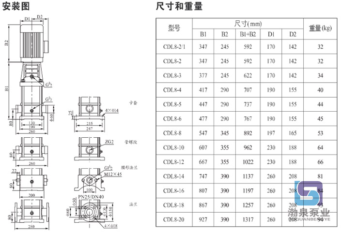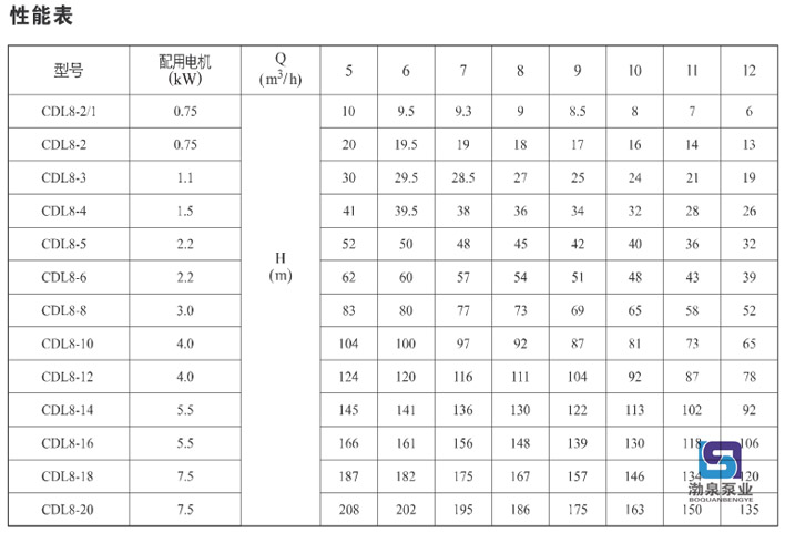 產品介紹 CDLF8-18FSWSC 不銹鋼立式多級離心泵是一種多功能產品,可以輸送從自來水到工業液體的各種不同介質,CDLF8-18FSWSC 不銹鋼立式多級離心泵適應于不同溫度、流量和壓力范圍,CDL不銹鋼多級泵適用于無腐蝕性液體,CDLF適用于輕度腐蝕性液體。 水:水廠過濾與輸送、水廠分區送水、主管增壓、高層建筑增壓。 工業增壓:流程水系統、清洗系統、高壓沖洗系統、消防系統。 工業液體輸送:冷卻和空調系統、鍋爐給水和冷凝系統、機床配套、酸和堿。 水處理:超濾系統、反滲透系統、蒸餾系統、分離器、游泳池。 灌溉:農田灌溉、噴灌、滴灌。 運行條件 稀薄、干凈、非易燃易爆并不含固體顆粒或纖維的液體。 液體溫度:常溫型 -15℃至+70℃ 熱水型 -15℃至+120℃ 環境溫度:最高+40℃ 海拔:最高1000m CDLF8-18FSWSC 不銹鋼立式多級離心泵為安裝標準電機的非自吸式多級離心泵,電機軸通過泵頭用軸聯器直接與泵軸連接,拉桿螺栓將耐壓筒、過流部件固定在泵頭和進出水段之間,泵進出水口在泵底同一直線上;本泵可根據需要配置智能保護器,對泵干轉、缺相、過載等進行有效保護。 電機 電機為全封閉,風冷式二極標準電機。 防護等級:IP55 絕緣等級:F 標準電壓, 50Hz 因產品生產批次、型號不同,產品圖片及安裝尺寸僅供參考,詳情可聯系我們的銷售人員了解更多CDLF8-18FSWSC 不銹鋼立式多級離心泵相關信息!