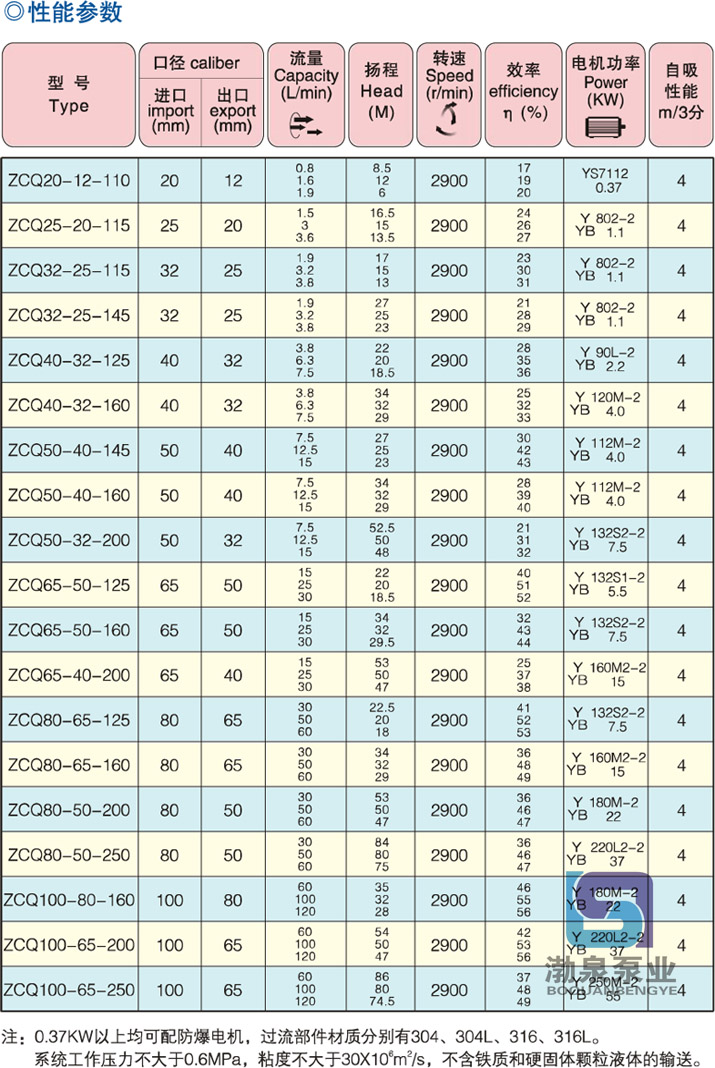 產品介紹 ZCQ50-40-160 自吸不銹鋼磁力泵(以下簡稱自吸泵)是根據眾用戶的要求,在CQ型磁力泵的基礎上吸取國外技術,并經過工程技術人員反復研究試驗而成功的新產品。 ZCQ50-40-160 自吸不銹鋼磁力泵以靜密封取代動密封,使泵的過流部件處于完全密封狀態,徹底解決了其它泵機械密封無法避免的跑、冒、滴、漏之弊病,泵體及過流部件的材料均采用了耐腐蝕的不銹鋼、鋼玉陶瓷、四氟石墨等材料制造,既有CQ型磁力驅動泵的功能,又集自吸于一身,不需底閥和引灌水,自吸高度4米。 ZCQ50-40-160 自吸不銹鋼磁力泵結構緊湊,外形美觀,體積小,噪音低,運行可靠,使用維修方便,可廣泛用于石油、化工、制藥、電鍍、印染、食品、科研等單位抽送酸、堿、油類及稀有貴重液、毒液、揮發性液體,以及循環水設備配套,特別是易漏、易燃、易爆液體的抽送。 因此,它是有廣泛的用途,我們真誠地向用戶推薦這種ZCQ100-65-250防爆自吸磁力泵。 型號意義: ![]() 結構圖: ![]()