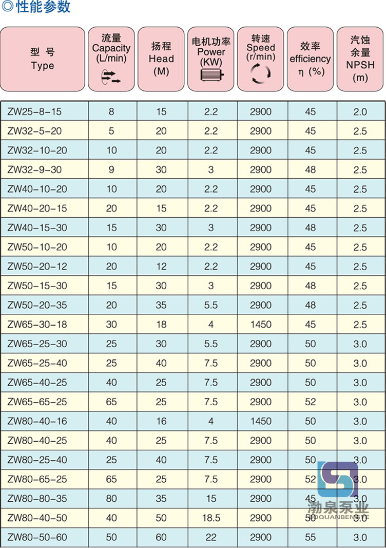 產品介紹 ZW65-25-30 無堵塞自吸污水泵是根據ZX型自吸離心泵及QW型潛水排污泵的結構及性能,借鑒國外同類產品之優點,研制而成的集自吸及排污于一身的泵種。既可像一般清水自吸泵那樣不需安裝底閥,不需灌引水,又可抽吸含有大顆粒固體直徑為出口口徑的60%和纖維長度為葉輪直徑1.5倍的污物、沉淀物、廢礦雜質、糞便處理及一切工程污水物和膠質液體,完全減輕人力的勞動強度,而且安裝使用方便,極少維修,具有廣闊的應用市場和發展前景。 適用范圍: ZW65-25-30 無堵塞自吸污水泵適用于化工、石油、制藥、采礦、造紙、纖維、漿料、紡織、食品、電廠及市政排污工程、公共設施排污、河塘養殖等行業。 產品優點: 1、排污能力強:特殊的葉輪防堵設計,確保了泵高效且無堵塞。 2、高效節能:采用優秀水力模型,效率比一般自吸泵高3~5%。 3、自吸性能好:自吸高度比一般自吸泵高1米,且自吸時間更短。 技術參數: 流量:5-800m3/h; 揚程:12-60m; 電機功率:2.2-55KW; 轉速:1450-2900r/min; 口徑:φ25-φ300; 介質溫度:≤100℃; 自吸高度:4.5-6.0m。 ![]() 結構及工作原理: ZW65-25-30 無堵塞自吸污水泵主要由泵體、葉輪、后蓋、機械密封、泵軸、軸承座、進口閥、氣液分離管、加水閥門、進、排接管等組成。泵的結構見下圖。 自吸式無堵塞排污泵的工作原理:泵體內設有儲液腔,并通過上方的回流孔和下方的循環孔與泵工作腔相通,構成泵的軸向回流外混式系統。泵停止工作后,泵內腔已儲有一定容積的液體。當泵起動時,泵內的儲液在葉輪的作用下,夾帶著空氣被向上拋出,液體通過氣液分離管的網格回流到工作腔,氣體被排出泵外,使泵內形成一定的真空度,達到自吸的作用。 第二次工作時泵吸入口處裝有單向逆止閥,因此不需再加儲水即可起動。 ![]() ![]() 因產品生產批次、型號不同,產品圖片及安裝尺寸僅供參考,詳情可聯系我們的銷售人員了解更多ZW65-25-30 無堵塞自吸污水泵相關信息!