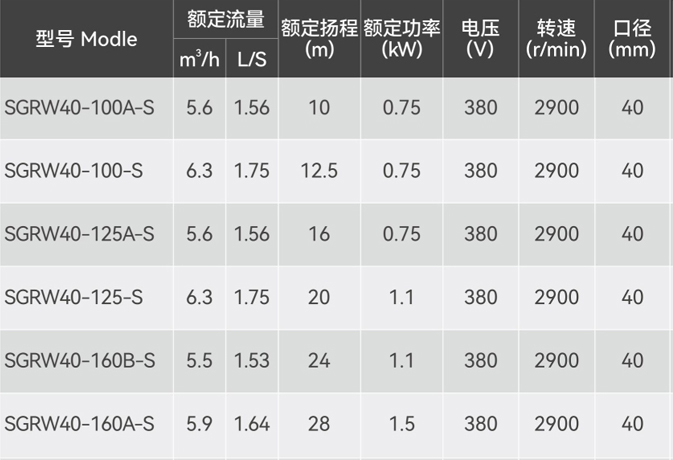 產品介紹 主要用途 SGRW40-125-S 臥式離心泵可供輸送清水及物理化學性質類似于清水的其他液體之用,適用于工業和城市給排水、高層建筑增壓送水、園林噴灌、消防增壓、遠距離輸送、暖通制冷等冷熱水循環增壓及設備配套、能源、治金、化工、紡織、造紙以及賓館、飯店等鍋爐熱水增壓輸送及城市采暖系統循環用泵,使用介質溫度T≤103℃。 產品特點 1、泵結構緊湊、體積小、外形美觀。 2、進出口徑相同,安裝方便,無需改變管路,可像閥門一樣直接安裝在管路任何部位。 3、機泵同軸,簡化了中間結構,增加了運行的平穩性,葉輪具有很好的動靜平衡,運行時震動小、噪音低,延長了軸承的使用壽命,改善了使用環境。 4、電機采用高效散熱鑄鋁機殼、進口軸承、不銹鋼316焊接轉子軸、氟橡膠“O”形圈、氟橡膠機械密封,過流部件全部采用不銹鋼精密鑄造。 5、維修方便、無須拆卸管道,只要拆下連接架,取出電機及傳動組件即可進行檢修維護。 6、其結構,精心設計,不僅縮小了泵房面積,改善了空間,而且大大節省基建投資。 7、可定制防爆電機,可定制四氟機封。 使用條件 1、適用介質:固體不溶物體積含量不超過單位體積的0.1%,粒度不大于0.2mm。(介質如帶有細小顆粒須采用耐磨式機械密封,請在訂貨時說明。) 2、周圍環境溫度不超過40℃,相對濕度不超過95%,海拔高度不超過1000m; 3、輸送介質的PH值304(4-10)、316(2-13); 4、輸送介質的密度≤1.05×103kg/m3; 5、使用電壓220V/380V,頻率50Hz,電壓波動不超過額定值的±10%。 型號說明 ![]() ![]() 因產品生產批次、型號不同,產品圖片及安裝尺寸僅供參考,詳情可聯系我們的銷售人員了解更多SGRW40-125-S 臥式離心泵相關信息!
