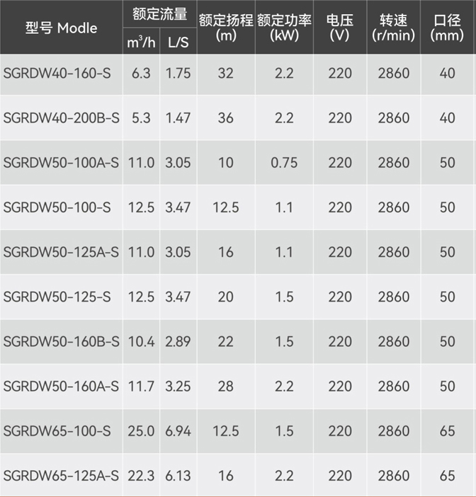 產品介紹 主要用途 SGRDW65-125A-S 不銹鋼臥式離心泵可供輸送清水及物理化學性質類似于清水的其他液體之用,適用于工業和城市給排水、高層建筑增壓送水、園林噴灌、消防增壓、遠距離輸送、暖通制冷等冷熱水循環增壓及設備配套、能源、治金、化工、紡織、造紙以及賓館、飯店等鍋爐熱水增壓輸送及城市采暖系統循環用泵,使用介質溫度T≤103℃。 產品特點 1、泵結構緊湊、體積小、外形美觀。 2、進出口徑相同,安裝方便,無需改變管路,可像閥門一樣直接安裝在管路任何部位。 3、機泵同軸,簡化了中間結構,增加了運行的平穩性,葉輪具有很好的動靜平衡,運行時震動小、噪音低,延長了軸承的使用壽命,改善了使用環境。 4、電機采用高效散熱鑄鋁機殼、進口軸承、不銹鋼316焊接轉子軸、氟橡膠“O”形圈、氟橡膠機械密封,過流部件全部采用不銹鋼精密鑄造。 5、維修方便、無須拆卸管道,只要拆下連接架,取出電機及傳動組件即可進行檢修維護。 6、其結構,精心設計,不僅縮小了泵房面積,改善了空間,而且大大節省基建投資。 7、可定制防爆電機,可定制四氟機封。 使用條件 1、SGRDW65-125A-S 不銹鋼臥式離心泵適用介質:固體不溶物體積含量不超過單位體積的0.1%,粒度不大于0.2mm。(介質如帶有細小顆粒須采用耐磨式機械密封,請在訂貨時說明。) 2、周圍環境溫度不超過40℃,相對濕度不超過95%,海拔高度不超過1000m; 3、輸送介質的PH值304(4-10)、316(2-13); 4、輸送介質的密度≤1.05×103kg/m3; 5、使用電壓220V/380V,頻率50Hz,電壓波動不超過額定值的±10%。 型號說明 ![]() ![]() 因產品生產批次、型號不同,產品圖片及安裝尺寸僅供參考,詳情可聯系我們的銷售人員了解更多SGRDW65-125A-S 不銹鋼臥式離心泵相關信息!