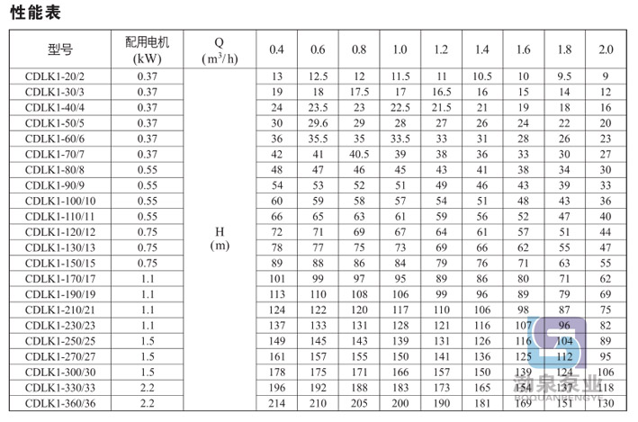 產品介紹 一、概述 CDLKF1-30/3浸入式多級離心泵為安裝標準電機 為滿足水槽或容器的安裝深度,可安裝空腔體來改變泵本身的長度,不同的級數長度見尺寸和重量表和可供產品范圍表。 二、應用范圍 CDLKF1-30/3液下式多級離心泵用于輸送機床冷卻液、潤滑液、冷凝水輸送、工業清洗設備和其它適合浸入式泵使用的場合,適合于不同溫度、流量和壓力范圍,CDLK適用于無腐蝕性液體,CDLKF適于輕度腐蝕性液體。 具體用于電火花、車床、磨床、加工中心、冷卻裝置、工業清洗設備、過濾系統等。 三、電機 電機為全封閉,風冷式二極標準電機。 防護等級:IP55 絕緣等級:F 標準電壓:50HZ:1*220-230/240V 3*200/346V 3*220-240/380-415V 3*220-225/380-440V 其他電壓的電機按要求可供。 單相電壓從0.37-2.2kw可供。 四、運行條件 CDLKF1-30/3浸入式多級離心泵適用于稀薄、干凈、不含固體顆粒和纖維的非易爆液體,可輸送水及冷卻用水溶液和切割潤滑液。 液體溫度:常溫型-15℃~+70℃ 熱水型+70℃~+120℃ ![]() 因產品生產批次、型號不同,產品圖片及安裝尺寸僅供參考,詳情可聯系我們的銷售人員了解更多CDLKF1-30/3浸入式多級離心泵相關信息!