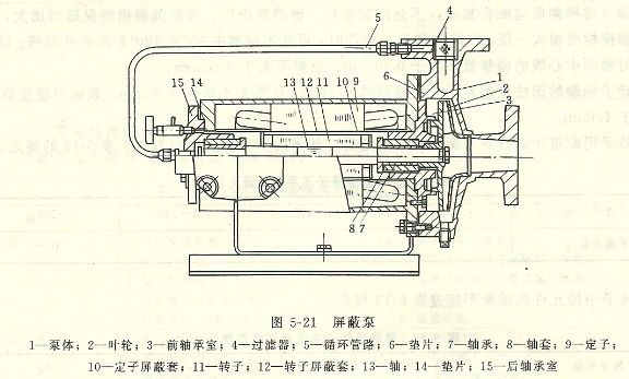 屏蔽泵的原理,屏蔽泵工作原理,屏蔽泵的結構 屏蔽泵工作原理從結構上看,它仍屬于管道離心泵的一個類型。如圖5 21所示,它的特點是泵的葉輪2和電動機轉子11連成一體,并且一同裝在一個密封的殼體中這樣就不需要任何動密封裝置,而從根本上消除了泄漏的可能性,故適用于輸送易燃、易爆、有毒、有放射性和貴重的料液。