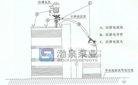 防爆區(qū)域:不是所有的SB系列桶泵都可以用于防爆區(qū)域,輸送易燃易爆流體只有防爆電機配合不銹鋼泵管才可以用于防爆區(qū)域,同時需要安裝防靜電裝置(如下防靜電裝置示意圖)
